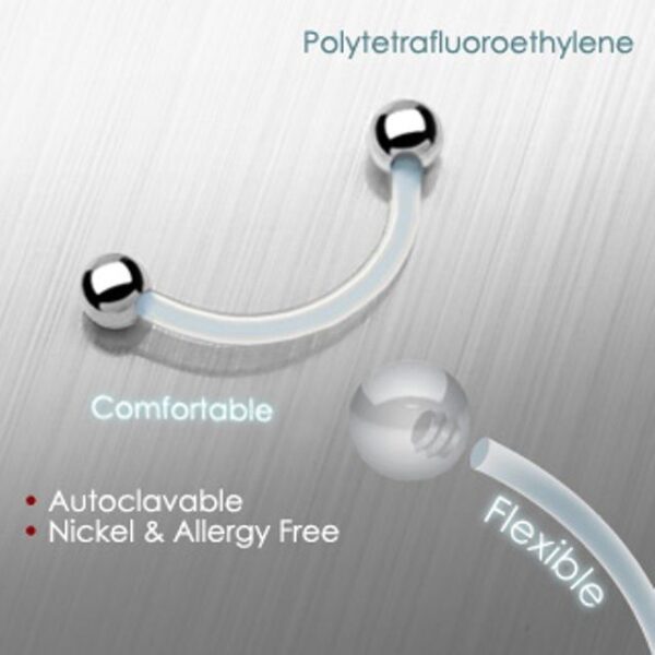 PTFE bio flex barbells in 14 gauge are perfect for comfort. The barbells can be cut to length and simply screw the ball on to re-thread the barbell. The barbell comes in 1/2″ (12mm) long with 4mm balls or 1″ (25mm) in length with 5mm balls.