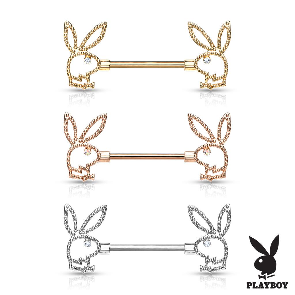 Beaded Edge Crystal Eye Playboy Nipple Bar. A beautiful nipple barbell with the outline of the iconic bunny manufactured from brass with an ion plated finish. The beaded outline gives the Playboy Bunny an eye catching look finished off with sparkling crystals for the bunny eyes. This item is available as a single barbell or a pair and in gold, rose gold or steel finish.