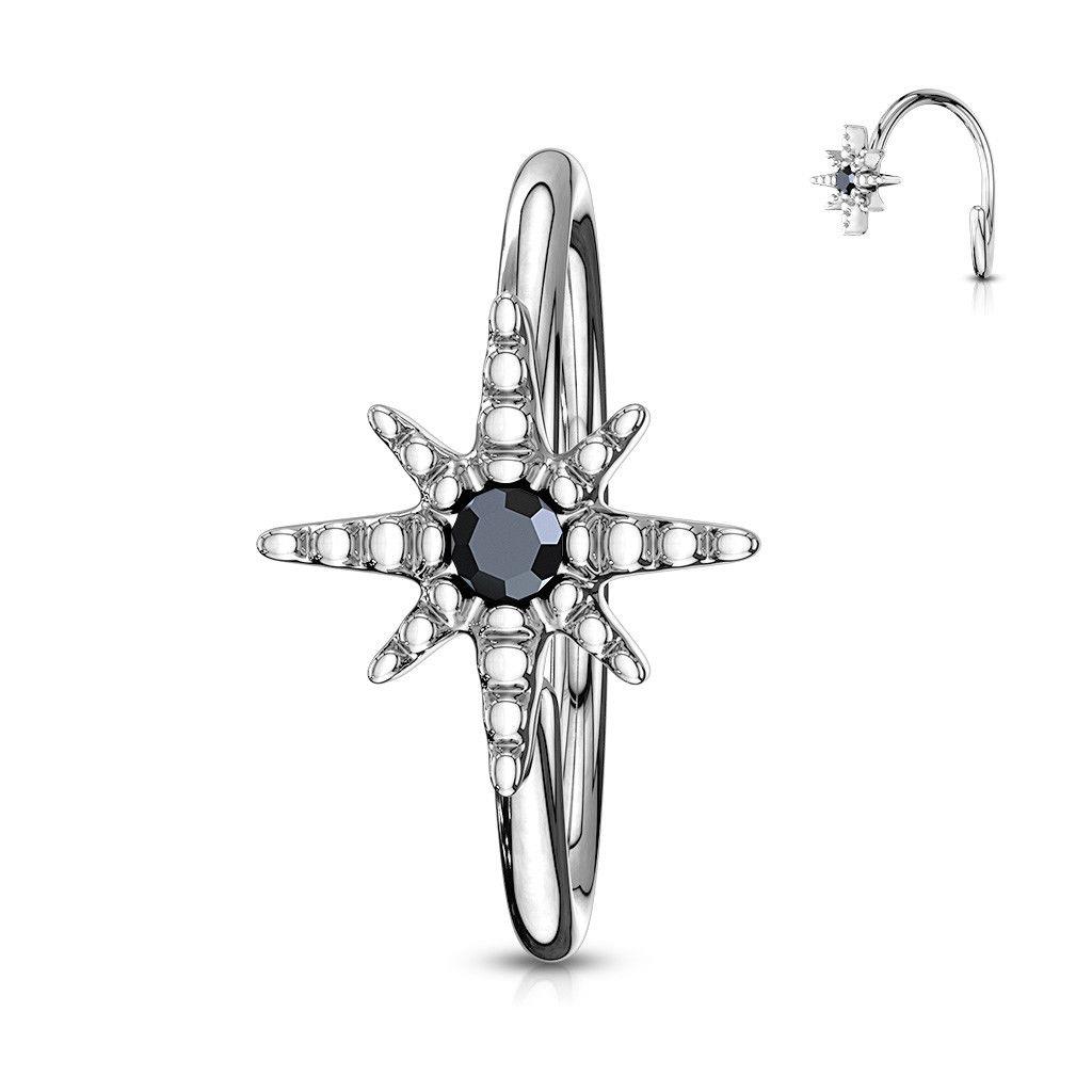 Black CZ Centred Starburst Hoop / Cartilage Ring. 100% Brand New & High Quality. Hoop Gauge : 20 g (0.8 mm). Hoop Diameter : 5/16″ (8 mm) Hoop Material : Rhodium Plated Brass Star Material : Brass Star Finish : Rhodium Plating. Stone Material : Cubic Zirconia.