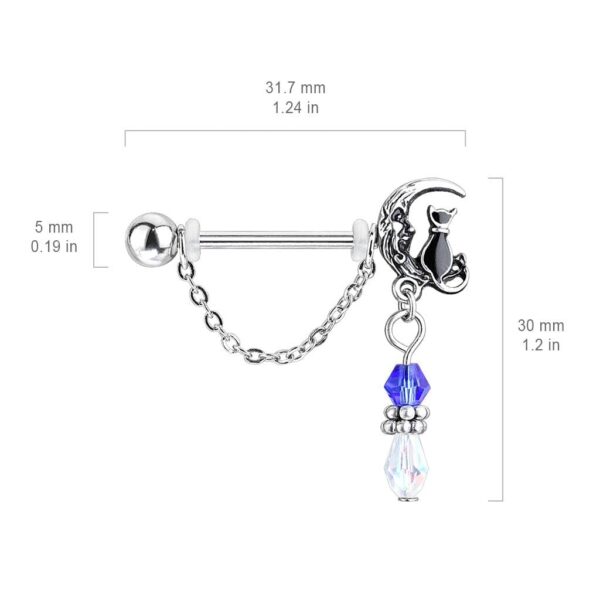 Cat & Moon Nipple Bars With Dangle Chain & Beads. Beautiful nipple bars featuring a cat sitting on the moon and on the opposite end a 5mm surgical steel ball. Also featured are dangle chains that sit below the nipple and dangle beads. Manufactured from surgical steel the barbell is 14 gauge in diameter and has a wearable length of 14mm. Sold in pairs only.