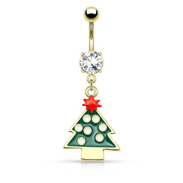 Christmas Tree Dangle Belly Bar / Navel Ring. This fun design Christmas belly bar comes with an enamel painted green dangle Christmas tree with white painted baubles. With a prong set CZ bottom ball & 5mm top ball the entire piece has a 14k gold plated finish. The barbell is 14 gauge in diameter, 10mm long & crafted from surgical steel.