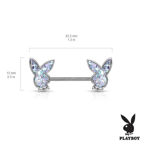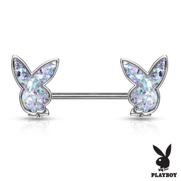 Druzy Stone Playboy Bunny Nipple Barbell. A beautiful product to add to our every growing range of Playboy jewellery. This nipple bar has ends that are filled with white synthetic Druzy stones to give a stunning look. The barbell is manufactured from surgical steel, is 14 gauge in diameter and has a wearable length of 14 mm. This product can also be purchased as a pair or a single barbell.