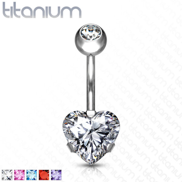 Implant Grade Titanium CZ Heart Belly Bar. A beautiful heart belly bar manufactured from solid implant grade Titanium with a prong set CZ heart. Available in various colours.