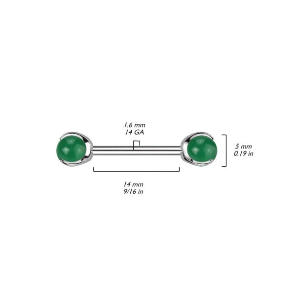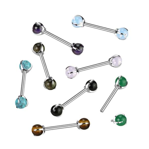 Implant Grade Titanium Internally Threaded Nipple Barbell With Claw Set Natural Stone Ends. A beautiful nipple bar manufactured from 100% implant grade Titanium. The barbell is 14 gauge and has a wearable length of 14 mm while the ends feature claw set natural semi precious stones.