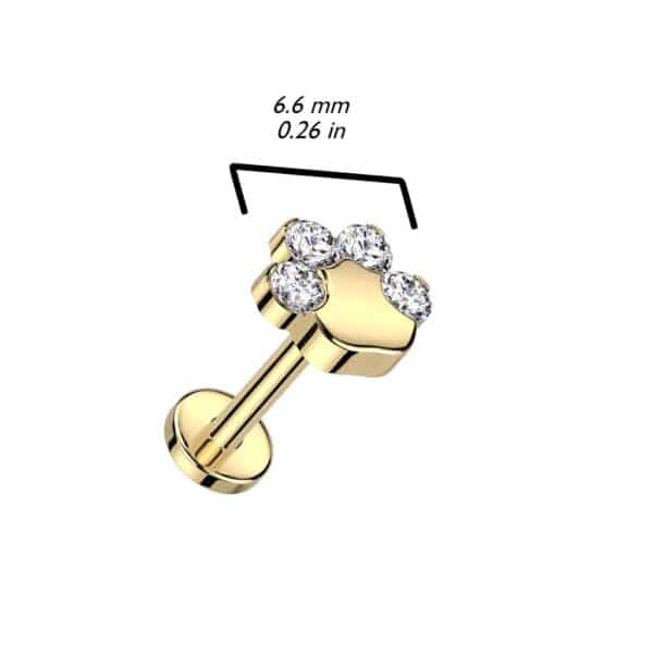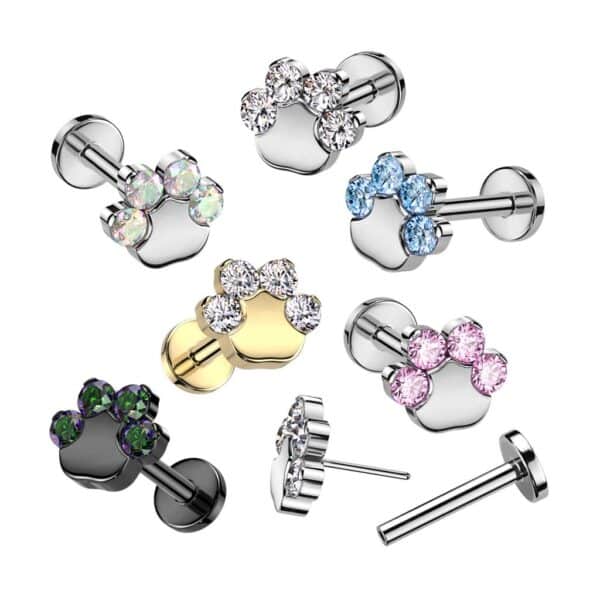 Implant Grade Titanium Threadless Labret With CZ Paw Top. A beautiful stud manufactured from Implant Grade Titanium. The threadless design makes fitting and removal of the jewellery hassle-free in comparison to threaded jewellery. The stud is suitable for labret, Monroe, cartilage piercings and more. This stunning piece has a pet paw shaped top with cubic zirconia stones and is available in various colours. The post on these studs are 18 gauge and have a wearable length of 8 mm.
