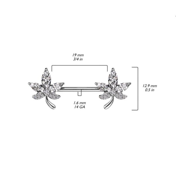 Surgical Steel Nipple Bar With CZ Leaf Ends. A beautiful nipple bar with Cubic Zirconia leaf ends. The 14 gauge barbell has a wearable length of 12mm and is manufactured from surgical steel. Featuring butterfly ends with CZ stones that are made from brass with either a Rhodium or Gold plating depending the option selected.