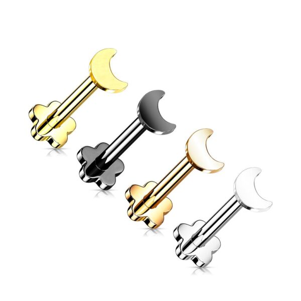 Titanium Threadless Push in Flower Base Labret With Crescent Moon Top. A beautiful stud manufactured from Implant Grade Titanium and threadless to provide a more comfortable and easier fit. The flower back stud is suitable for monroe, cartilage piercings and more. This stunning piece has a crescent moon shaped top and is available in various colours. The bar is 16 gauge and has a wearable length of 8 mm.